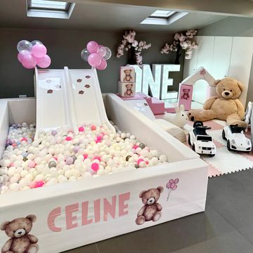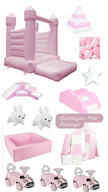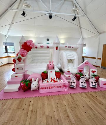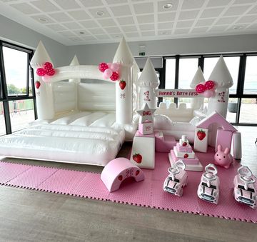 This is our brand new Bubblegum Pink castle with matching white and pink soft play. Package price inclusive of castle, ball pit, a full soft play set up, all personalised and inclusive of an LED light up number